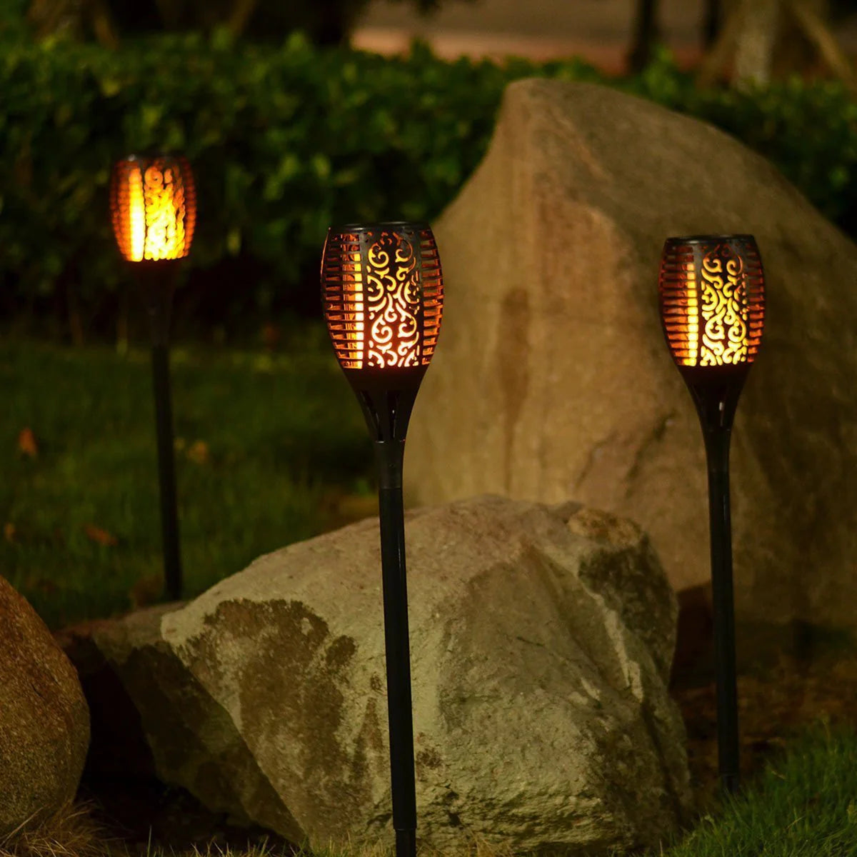 addition for your yard or perfect for an outdoor area. The flickering lights simulate the warming play of flames over your garden. The hollowed-carved metal helps bring a magical fire lighting effect over your lawn, beside your gate or along a path. Elegant by day and intriguing at night, the Outdoor Solar Torch adds a festive and mysterious atmosphere for the party or those cozy nights.